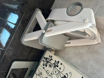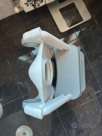 Vendesi pratico riduttore WC con scaletta integrata, ideale per aiutare il bambino a imparare a usare il bagno in totale autonomia e sicurezza. Caratteristiche: • Design 2-in-1: Riduttore con seduta morbida imbottita e scaletta con gradino antiscivolo. • Sicurezza: Dotato di ampi manici laterali per offrire stabilità al bambino durante la salita e la discesa. • Stabilità: Piedini regolabili che si adattano a diverse altezze e tipi di sanitari. • Igiene: Seduta facilmente smontabile e lavabile; il design permette di ripiegarlo quando non in uso per risparmiare spazio. • Estetica: Simpatico decoro a forma di ranocchia grigia/bianca, adatto a ogni bagno. Condizioni: Ottimo stato, pulito e igienizzato. Tutte le plastiche sono integre e i gommini antiscivolo sono presenti.