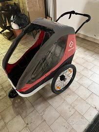 Rimorchio hamax per due bambini, completo di zanzariera, antipioggia, parasole. Con ampio “bagagliaio” porta oggetti. Bandierina di segnalazione. Istruzioni di montaggio e ruota anteriore per renderlo un passeggino. Facile da usare, comodo. Usato solo 1 stagione. Ottime condizioni!