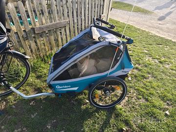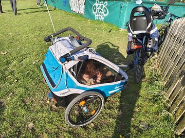 Rimorchio bici per bambini, 2 posti. Con ruota anteriore a parte per l'uso da passeggio.
