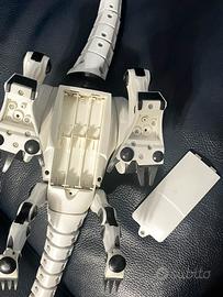 Roboreptile, dinosauro telecomandato dal design unico. Dotato di telecomando, cappuccio e istruzioni. Funziona con 9 pile stilo ( 6 per il roboreptile e 3 per il telecomando). Dotato di numerosi sensori(tattile, visivi a infrarossi, acustici stereo) per interagire con l’ambiente circostante. Numerose modalità di interazione. Programmabile con un massimo di 20 azioni. Perfettamente funzionante con contatti integri come da foto. Dimensioni 70x16x16