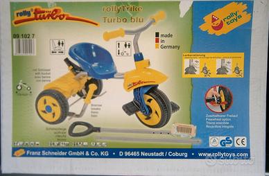 Vendo triciclo ,marca Rolly Toys,, prodotto in Germania,telaio molto robusto, materiali molto,resistenti,con vaschetta porta oggetti,freno in ferro con leva in plastica, aggancio per manico estraibile per spingere in bambino quando non vuole pedalare, blocco direzione manubrio.Completo di scatola e istruzioni originali.Pari al nuovo Pagato 79 euro