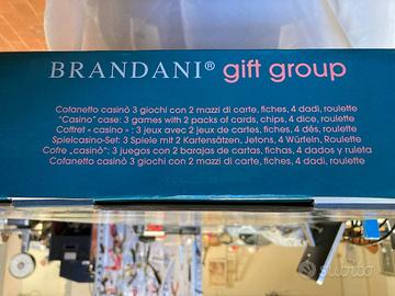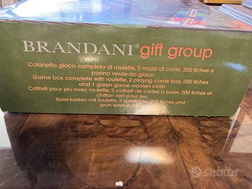 A disposizione 2 roulette Brandani Outside, 3 giochi completi con fiches, un set da gioco in legno Brandani con fiches, ed un set roulette più piccolo con panno verde e fiches, tutti mai utilizzati e solo aperti per controllare il contenuto, risalenti a fine anni '90 inizio 2000, seguono prezzi: