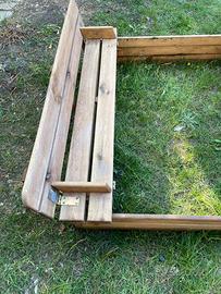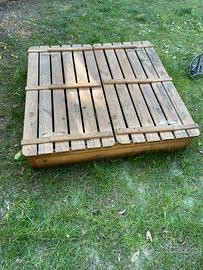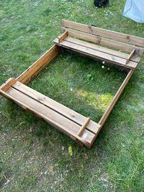 Sabbiera in legno 115 cm per 120 cm, con coperchio che si trasforma in panchina. Telo di copertura con elastici. Buone condizioni