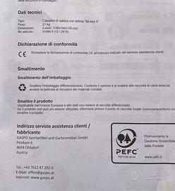 Sabbiera Gaspo per bambini in legno misura grande cm 140 x 140 usata pochissimo quindi in condizioni più che ottime, unico difetto il tetto rovinato in un angolo come si vede nella foto 5. Completo di tutti i pezzi e del libretto istruzioni, caratteristiche come indicato in foto.