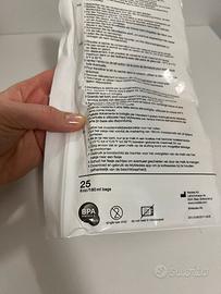 Mi sono rimaste le buste chiuse con i sacchetti per surgelare il latte materno Una busta ha 25 sacchi (i sacchetti da 180 ml)