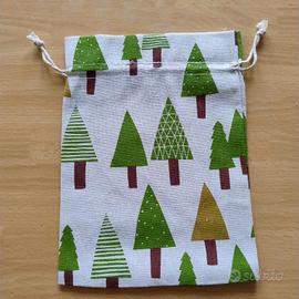 11 sacchettini in fibra naturale (cotone dahi) 17x23 cm con una stampa di alberi di Natale stilizzati in varie sfumature di verde, tronchi marroni, chiusura con coulisse in cordoncino bianco per confezionare doni in modo originale, ecologico e riutilizzabile. Nuovi mai usati