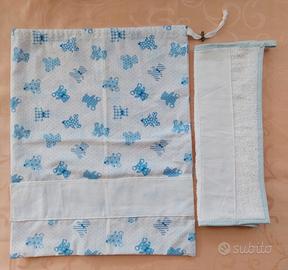 il sacchetto azzurro su richiesta si può ricamare il pupazzetto che piace più al bambino con il suo nome (es. stitch, macchinine o altro)