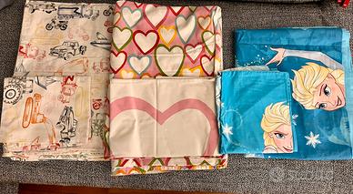 2 sacchi per piumini bambina con federa coordinata, 1 lenzuolo angoli fucsia e un lenzuolo e federa Elsa e Anna.