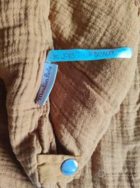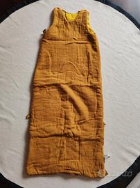 • sacco nanna 90cm, tg da 6-18mesi, morbido cotone, colore giallo-ocra con ricami, marchio moulin roty della collezione jolis trop beaux, colore giallo-ocra, chiusura a cerniera lunga laterale e due pressione automatiche sulle spalle, senza maniche, soffice e caldo per avvolgere il neonato, possibilità di stringerlo nella parte bassa.