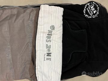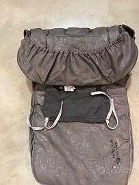 Sacco passeggino internonin pile parte inferiore tivedtita in plastica. Fori per cinghie passeggino, nastri elastici per legarlo a passeggino.