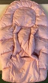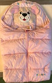 Morbido sacco imbottito per ovetto o passeggino, con un simpatico orsetto ricamato sul cappuccio. La chiusura è con zip.