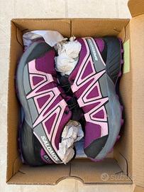 Scarpe da trekking impermeabili per bambina Salomon, taglia 33, colore viola/rosa/grigio, indossate solo per pochi minuti, erano della taglia sbagliata.