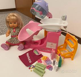 Il set include tutti gli accessori per ricreare un salone da parrucchiera. Sono incluso lavabo con poltrona, casco, carrello degli accessori, accessori. La doccia con getto d'acqua per lo shampoo è realmente funzionante. La bambola presenta segni di penna nel braccio e gamba sinistra. Usato poco.