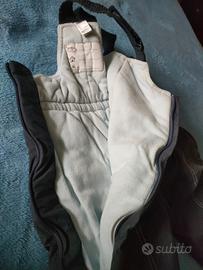 Vendo una salopette per uscire sulla neve della Decathlon, colore grigio, interno in pile bianco. Tg. 3 anni. Spalline regolabili con velcro, zip laterali lungo tutta la lunghezza che aiutano la vestibilità. Aperta anche in fondo alle gambe dove all'interno si trova una protezione per isolare le caviglie dalla eventuale neve che potrebbe entrare. Usata ma in ottimo stato.