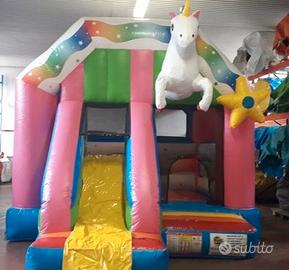 Gioco gonfiabile tema unicorno con scivolo e saltarello.