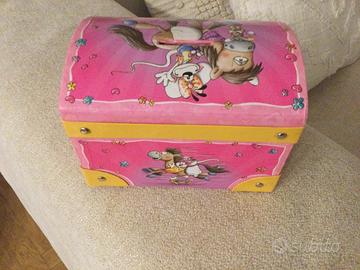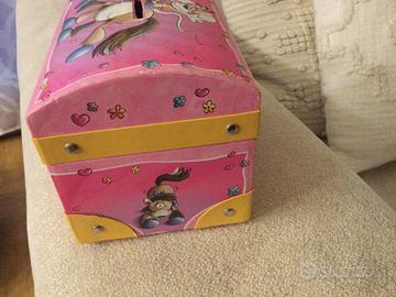 Bellissimo salvadanaio per bambine con doppio scomparto e fessura per monete. Misure: L.15cm x h.10 cm x P .10 cm Manca lucchetto.