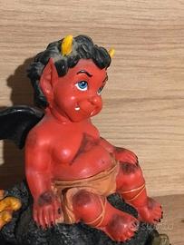 Salvadanaio in poliresina raffigurante un diavoletto seduto su un mucchio di rocce nere e monete d'oro, fessura posteriore e tappo di gomma sul fondo.