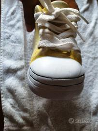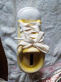 Salvadanaio in ceramica a forma di scarpetta da tennis gialla simile al Converse All star. Con veri lacci da scarpe