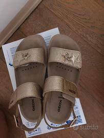 Sandali nuovi Geox bambina traspiranti realizzati con materiale effetto pelle oro metalizzato con suola traspirante. Nuovi mai usati. Taglia piede 32