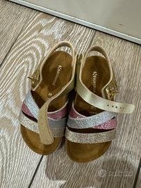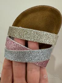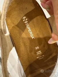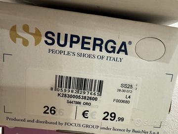 Sandali bambina Superga n. 26 vendo per cambio numero, messi 2/3 volte, con confezione perfetta. Tomaia in vera pelle, una fascia oro lineare e due che si incrociano rosa e argento. Con glitter.