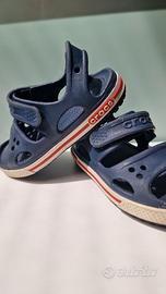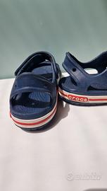 Sandali Crocs Crocband II, in ottime condizioni. Sono di colore blu scuro con dettagli bianchi e rossi.