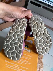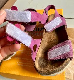 Sandalo in pelle bovina scamosciata lavorata senza cuciture, regolabile con velcro. Sottopiede in gomma-sughero ricoperto in pelle, battistrada in EVA