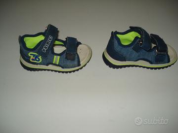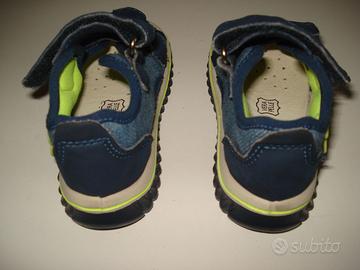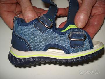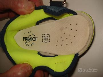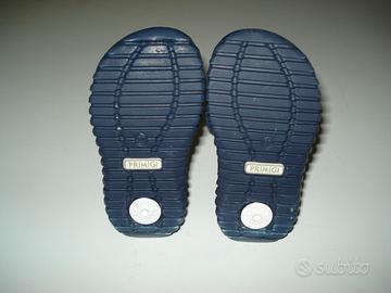 Famiglia privata vende come usato, in perfette condizioni, come nuovi, un paio di sandali per bambino della nota ditta italiana PRIMIGI, N. 20 (misura italiana), prodotto originale del Made in Italy. Questi simpatici sandali sono di materiale sintetico leggero, facilmente lavabile, con all'interno solette assorbenti e confortevoli di vera, morbidissima pelle. La loro suola è in gomma ben zigrinata antiscivolo; mentre, la comoda e veloce chiusura è a doppio strappo, in velcro, esternamente ricoperta di morbidissima pelle scamosciata sintetica colore blu notte come altre diverse rifiniture di questi bellissimi sandali, come pure in tessuto jeans. La pelle dell'attaccatura inferiore di entrambi i sandali è leggermente consunta; ma, ancora di ottima tenuta (come da ultima foto). Però, questo è un minimo difetto di precedente utilizzo e, una volta calzati e chiusi, non si nota affatto perché quella parte rimane nascosta dalla stessa fettuccina in pelle blu e velcro. Come detto, sono sandali leggerissimi, chiusi e rinforzati sul tallone per dare maggiore stabilità ed equilibrio al bambino che li indossa. Essi sono morbidi, flessibili e ben si adattano ai primi passi del vostro bebè. Sono indicati sia in città ed anche al mare.