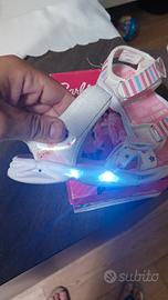sandalo Barbie n 29 con fondo bianco e sopra rosa con fasce di colore bianche rosse rose e azzurro e lo stemma di barbie sul primo strappo con luce colorate perfettamente funzionante.....in buono stato con scatola originale