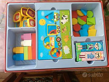 Un dolcissimo kit di giochi studiato per l'apprendimento dei più piccoli con un percorso educativo con le attività tipiche dei bambini dell'asilo nido. Grazie ai materiali di altissima qualità, ai colori brillanti e alle diverse forme e consistenze dei componenti del gioco, questo prodotto facilita e incoraggia lo sviluppo della manualità, della logica e della memoria