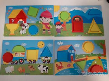 4 immagini da completare con tante formine di plastica, contiene 4 immagini in cartonato, 16 formine in plastica, il gioco è in ottime condizioni, segnalo 2 difetti nella scatola come da foto. Per bambini dai 2 anni in su.