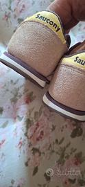 Scarpe Saucony Jazz Low Pro per bambina. - Taglia 21. - Chiusura a strappo. - Tomaia in camoscio e tessuto. - Dettagli gialli.