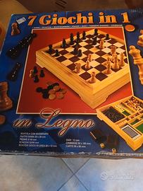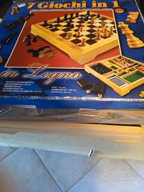 scacchiera in legno con dadi, domino, scacchi, cribbage,backgammon , pedine dama,carte, 2contenitori e 6 dadi, e' esteticamente bella perche' in legno e ben fatta,con istruzioni.Condizioni scatola e contenuto, come da foto.