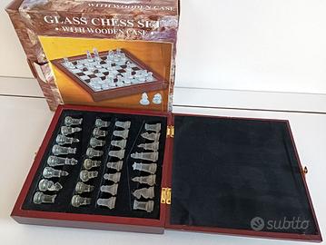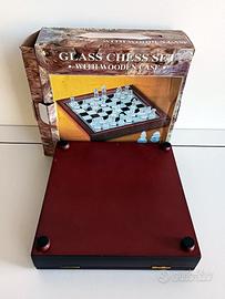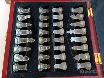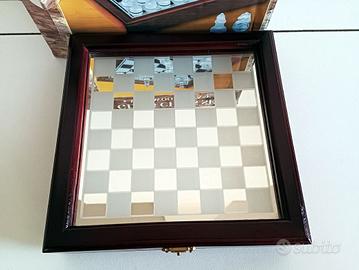 Scacchiera in legno color mogano con piano di gioco in specchio serigrafato e finiture in ottone. Set di pezzi da gioco in vetro lucido e smerigliato. Vano interno porta pezzi per trasporto sicuro. Nuova, mai utilizzata, in scatola originale. Richiesta Euro 30,00. Per veri intenditori del gioco degli scacchi. Misura del piano di gioco cm 18x18.