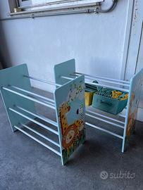 Due scaffalature portagiochi per bambini. Comodi e simpatici organizer completi di scatole richiudibili dove alloggiare svariati giocattoli. Ritiro a mano zona bologna e provincia.