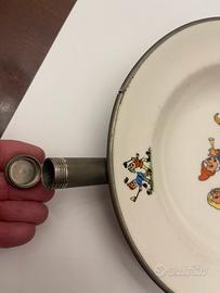 Scalda pappa originale, anno 1958, in metallo e ceramica. La parte sotto che contiene l’acqua calda è chiusa con un tappo sempre in metallo. Non garantisco la tenuta stagna dell’oggetto essendo molto vecchio, più per collezione che per utilizzare per un bambino.