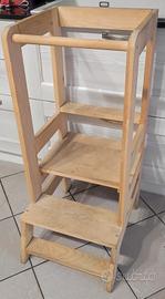 Vendo scaletta Montessori per bambini con gradino regolabile. Robusta, stabile e completamente in legno. Senza vernici. Misure: Alta 90 cm, larga 39 cm e profonda 50 cm. Non spedisco.