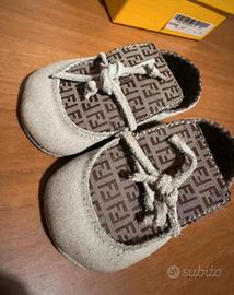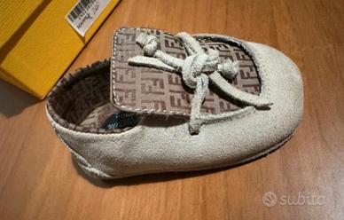 Vendo scarpine da culla Fendi originali in tessuto suede beige. • Condizioni: Buone, usate poco. • Nota bene: I lacci della scarpa sinistra sono rovinati/sfilacciati, come mostrato nelle foto di dettaglio. • Accessori: Complete di scatola originale e cartellino. Modello pre-walker elegante, ideale per occasioni speciali. Spedizione rapida. Scarpa ORIGINALE! PREZZO TRATTABILE !!