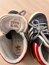 Scarpe marca Adidas modello alto colore blu e rosso con bande bianche n.27