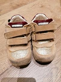 Scarpe originali balducci numero 19 in tessuto scamosciato con inserti glitter dorati e parti laccate bordeaux. Leggermente sporche sulla punta