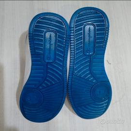 1 paio scarpe sportive alte Champion per bambino. Sono bianche con dettagli blu.