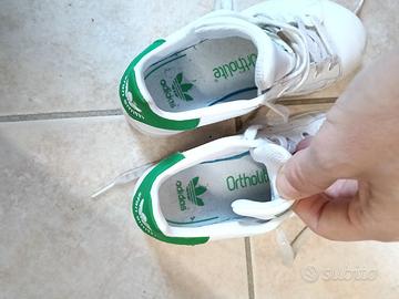 Vendesi scarpe adidas modello Stan Smith originale per bambini taglia 30 buonissime condizioni, usate meno di 5 volte perché il piede è cresciuto in fretta. Unico difetto da segnalare l'asola sulla linguetta che tiene i lacci al centro di una delle due scarpe si è leggermente scollata la pelle come da foto. Colore bianco e verde, possibilità di spedizione o consegna a mano a Latina e zone limitrofe