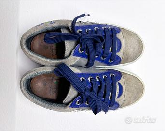 Sneakers da bambino/a, tg. 31, in pelle scamosciata (non sintetico) e con plantare in cuoio. Colore grigio e viola, in ottime condizioni di tomaia, solo le suole hanno dei punti di usura, come da foto.