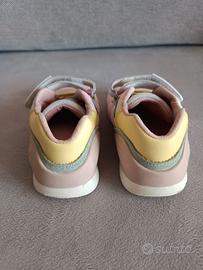 Scarpe da bambina Biomecanics originali, numero 24. Colore rosa con dettagli gialli e beige. Calzature ergonomiche sviluppate con istituto biomeccanico di Valencia, ideali per i primi passi. Chiusura a strappo, suola flessibile e antiscivolo. Usate ma in buone condizioni generali, normali segni di utilizzo sulla suola. Pulite e pronte all’uso.