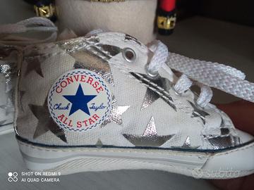 Scarpe Converse neonata, motivo a stelle argento n. 18, lacci bianchi con fili laminati dentro, unico piccolo difetto, sotto ad una leggero alone giallo ,( che non si nota indossate) dovuto allasciugatura. Per il resto bellissime e perfette ovunque