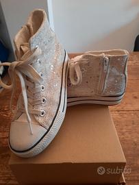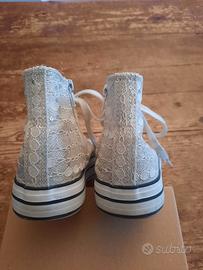 Vendo come in foto scarpe bianche con ricamo bianco e argento n. 34. Indossate per solo due occasioni.
