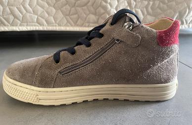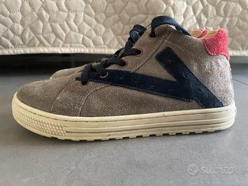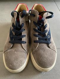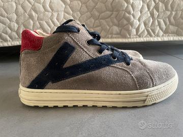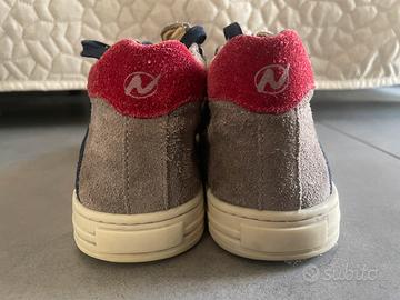 Scarpe alte da bambino marca Naturino. - Tomaia in camoscio grigio. - Dettagli in blu e rosso. - Chiusura con lacci blu. - Zip laterale. - Suola in gomma bianca. Numero 34, usate ma in buone condizioni.