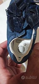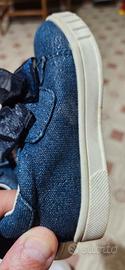 Scarpe Chicco 18-24 mesi misura 22 come evidenziato in foto. Scarpe in tessuto blu con effetto brillantini e fiocco di raso blu (vedi foto). Suole in vera pelle ottimo stato.