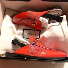 Meravigliose pantofole con elastico Gucci Kids Slippers Princetown numero 30 EU, internamente in pelle di vitellino rosa-beige ed esternamente in raso di seta di colore rosso e azzurro con iconico motivo tigre.