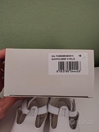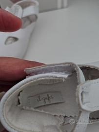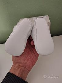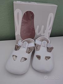 vendo come nuove scarpe da culla il Gufo mai utilizzate numero 18 in pelle bianca con dettagli traforati (cut-out), spesso chiamate "occhiello" o "occhio di bue". Il marchio è Il Gufo, un noto brand italiano di abbigliamento di lusso per bambini. Materiale: Morbida pelle di vitello (nappa). Design: Punta tonda con due fori decorativi sulla parte anteriore e chiusura con cinturino a strappo alla caviglia. Utilizzo: Ideali come scarpine "primi passi" o da culla, spesso scelte per cerimonie come il Battesimo.