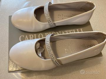 Ballerine da cerimonia nr 35 per bambina in pelle bianca con stringa stretch scamosciata con diamantini della collezione Carlo Pignatelli mod Ballerina gioiello SSC943J pagante 75 euro vendo come nuove con scatola indossate 2h per la comunione, pulite e sanificate e riposte nella scatola. Indossate sotto vestitino Liu Jo. Roma Nord Bocce Eur o Pomezia. Oppure spedisco SDA 7 euro 24h a casa vostra Info 3404031890